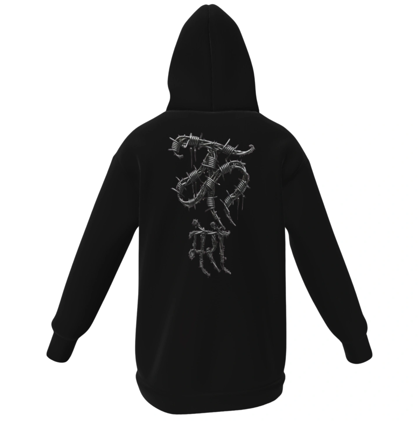 The metallic, sharp-wire effect creates a powerful visual statement while keeping the hoodie clean and minimal from the front—perfect for those who love dark fashion and bold back graphics.